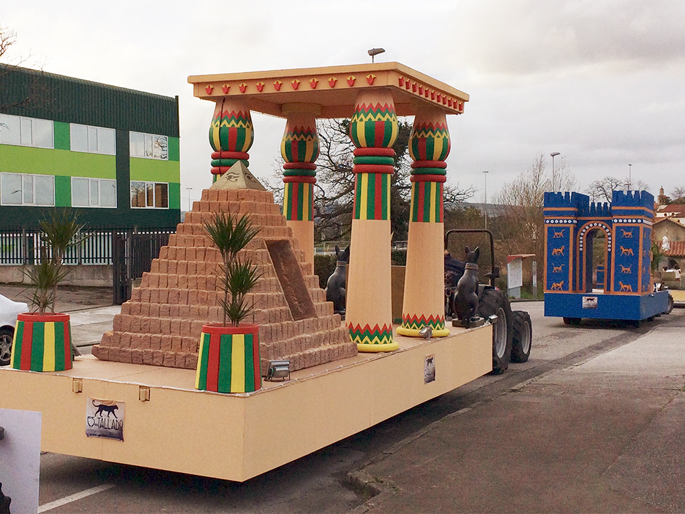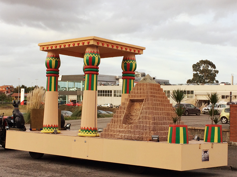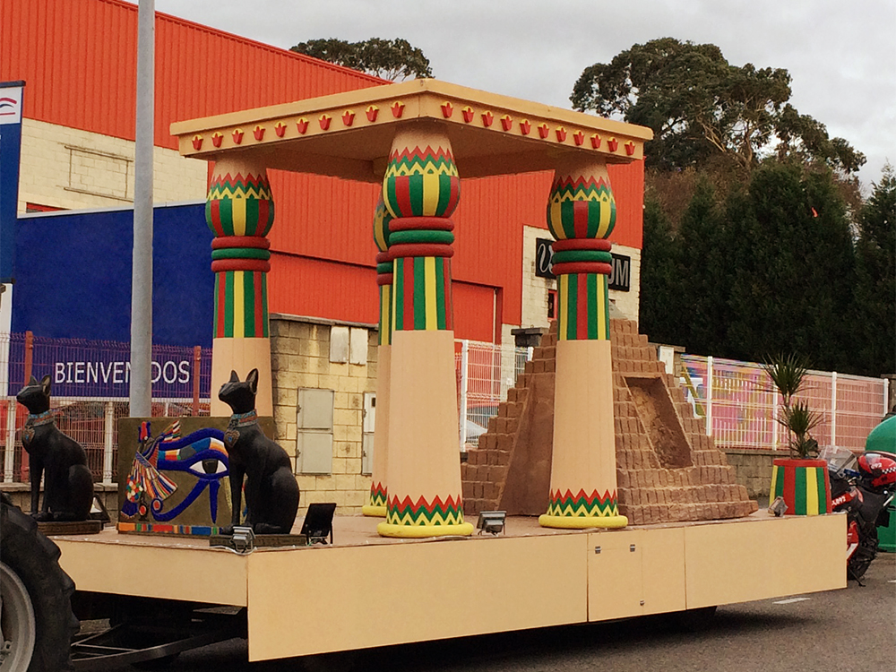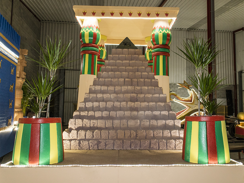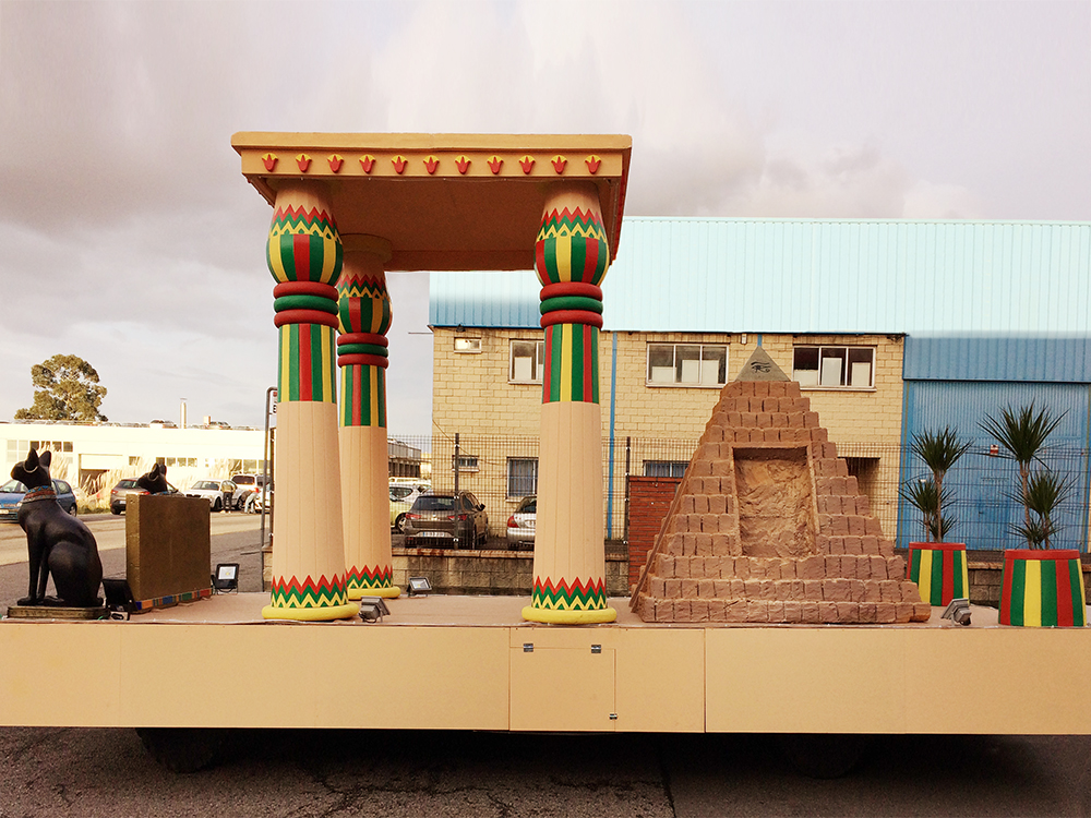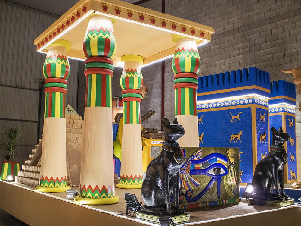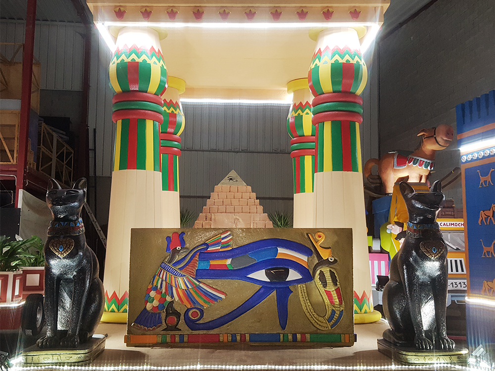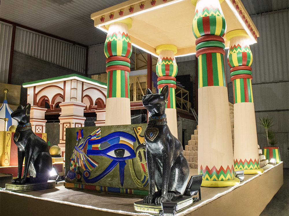 Carroza inspirada en Egipto, compuesta por dos Gatos, cuatro columnas Papiriformes que forman parte de un templete y una Pirámide con asientos en los laterales y el Ojo de Horus en la cúspide, para el Rey Baltasar en la Cabalgata de Reyes 2018 organizada por Divertia Gijón.