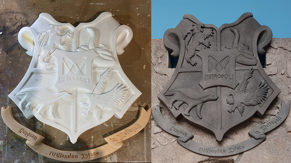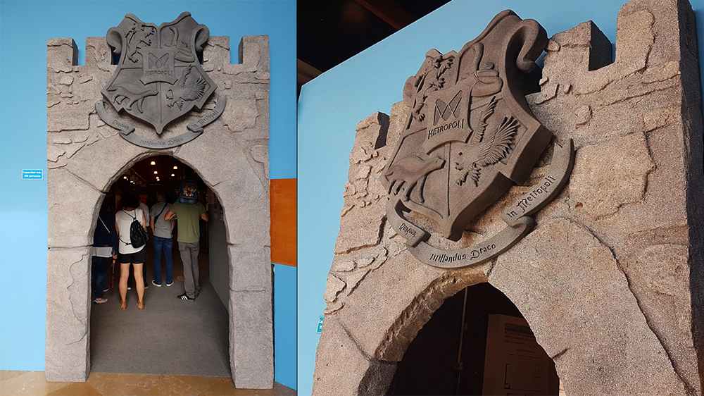 Escudo de Harry Potter y puerta tallados en Poliestireno Expandido, EPS, con acabado texturizado efecto granito, para Metrópoli Gijón 2018.