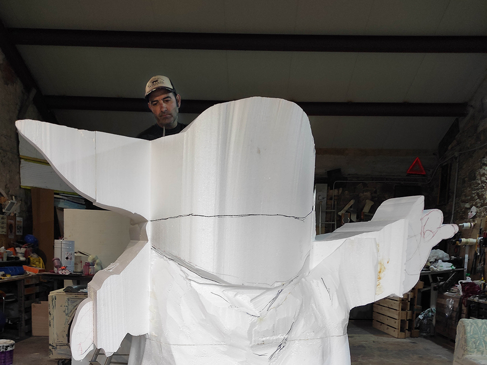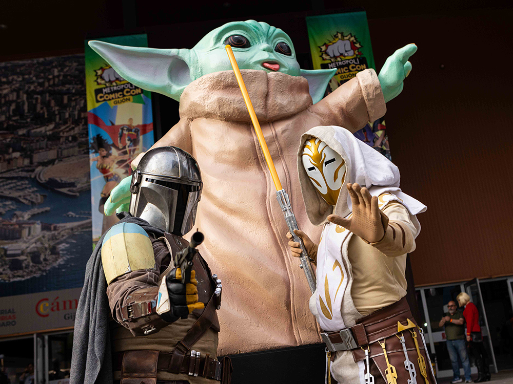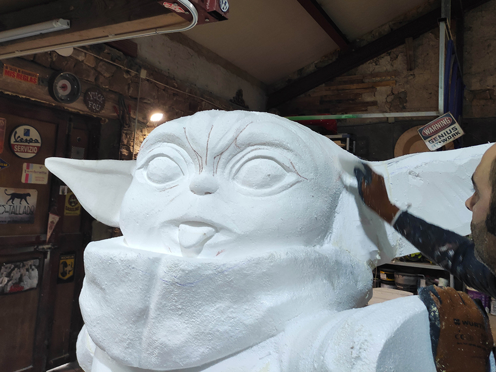 Figura de Grogu, baby Yoda, de 2m de altura, tallada en porexpán, endurecida con poliurea y acabado con pintura artística de alta calidad y poliuretano transparente. Con peana de 1m de altura realizada en madera hidrófuga. Escultura realizada por encargo del festival Metrópoli Gijón y la Comic Con 2022.