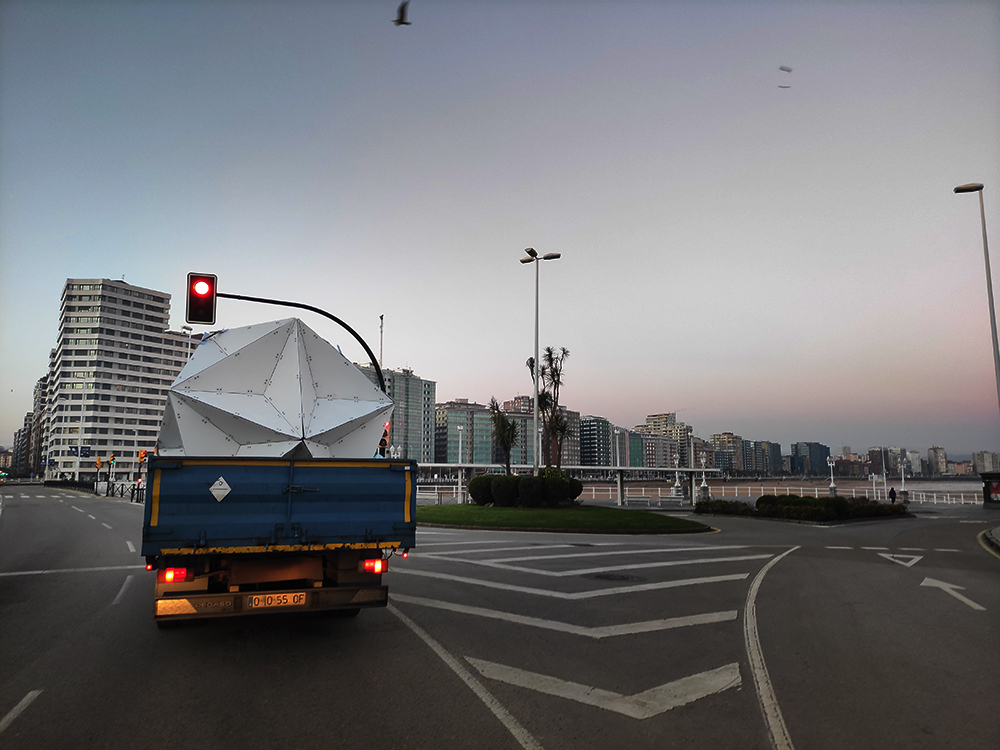Realizado mediante 57 triángulos de metacrilato espejo unidos entre sí por ángulos de acero inoxidable y estructura de aluminio interna con iluminación en su interior que emana a través de la separación de cada una de sus aristas.