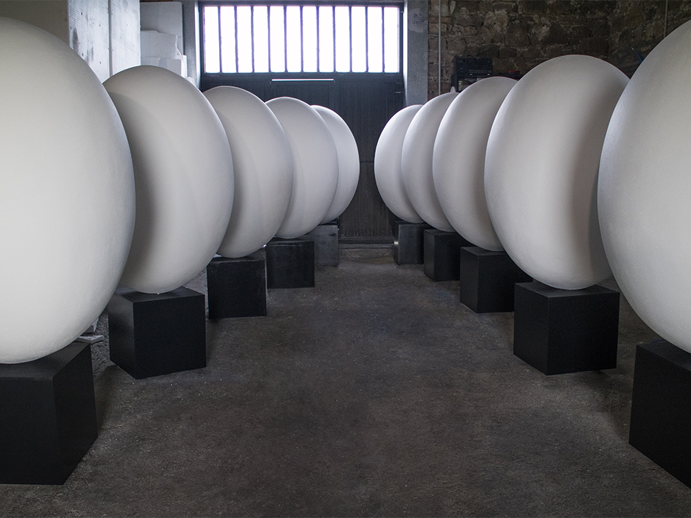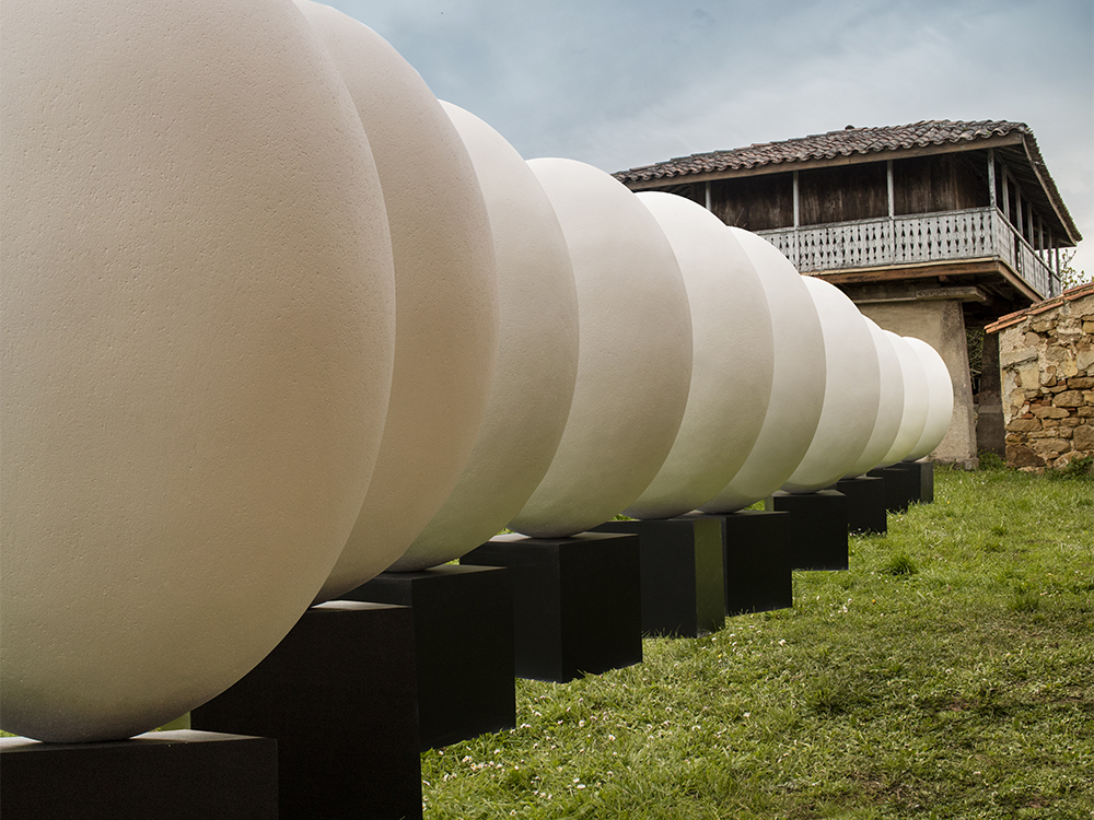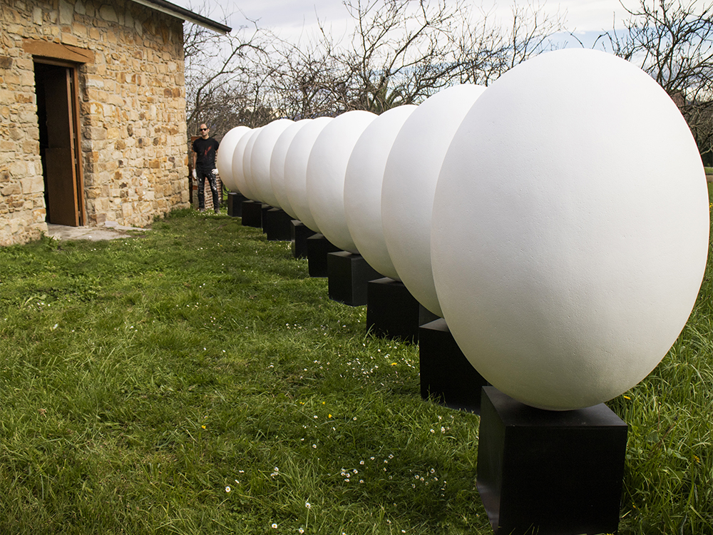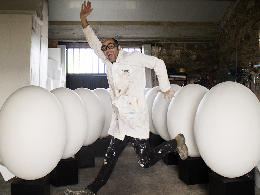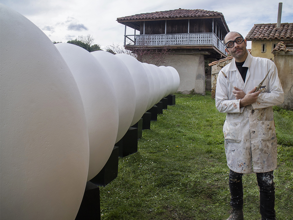 Talla de 12 huevos de 120cm de altura tallados en Poliestireno Expandido, porexpan, (EPS) con peana de madera de 40cm, para la III, IV Y V Edición del concurso Güevos Pintos organizado por el centro comercial Intu Asturias; en el que 12 colegios de Siero y Oviedo participaron decorándolos.