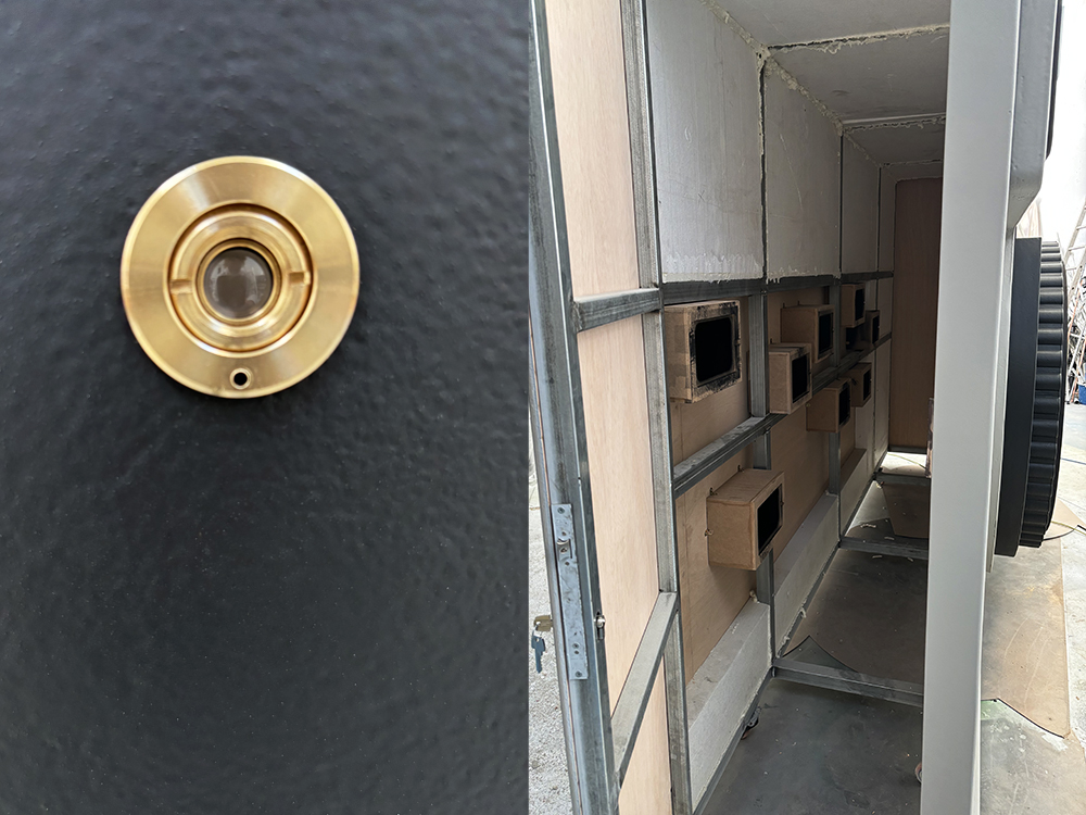 En su interior se integraron dispositivos audiovisuales (tablets) que proyectaban una selección de imágenes icónicas de la agencia Magnum, visibles a través de unas mirillas dispuestas a distintas alturas en la parte posterior de la cámara, generando una experiencia inmersiva y evocadora.