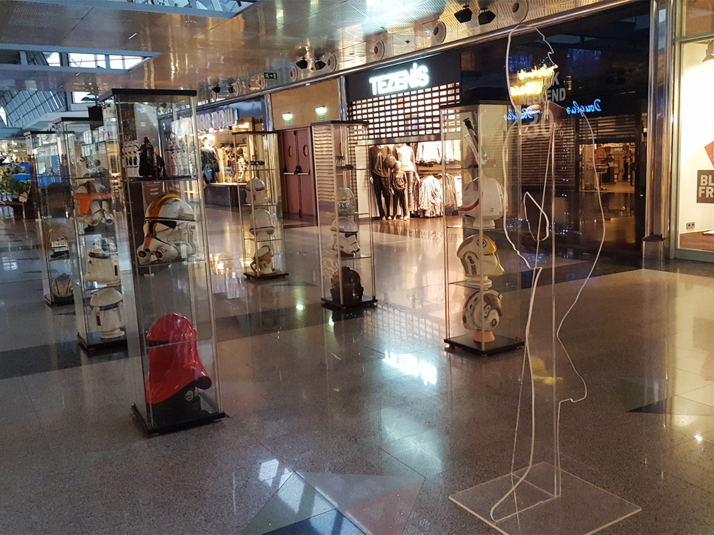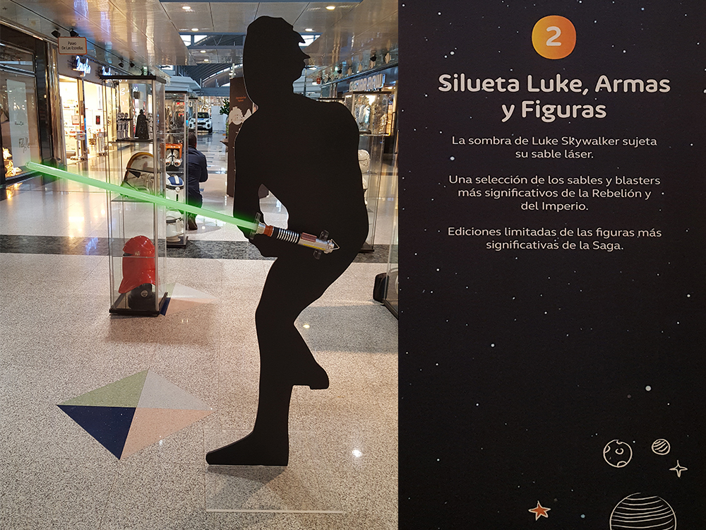 Silueta en metacrilato transparente con vinilo negro, para sujetar la espada de Luke Skywalker. Pieza de la exposición Expo Wars celebrada en Intu Asturias organizada por Metrópoli Gijón.