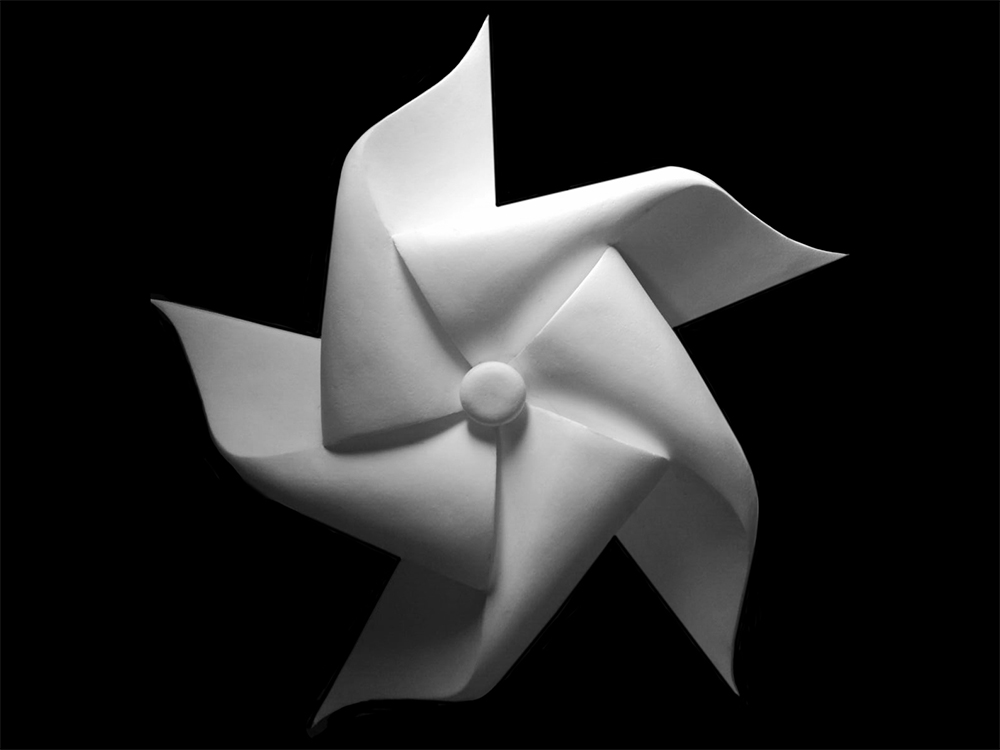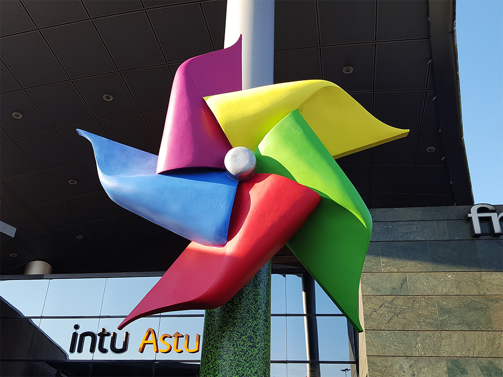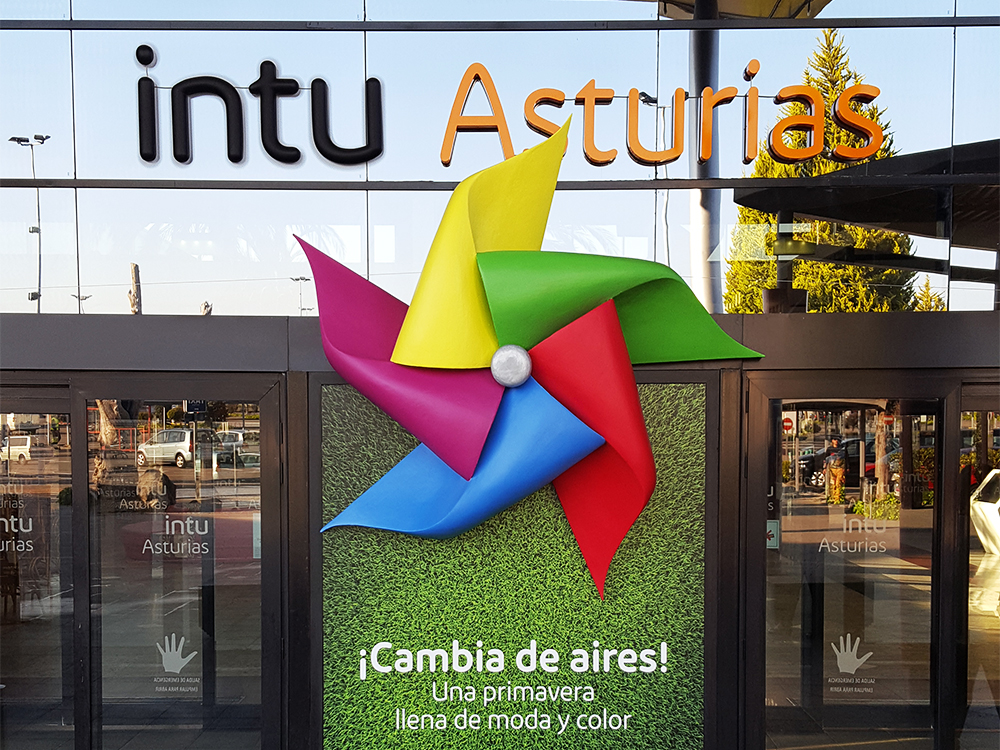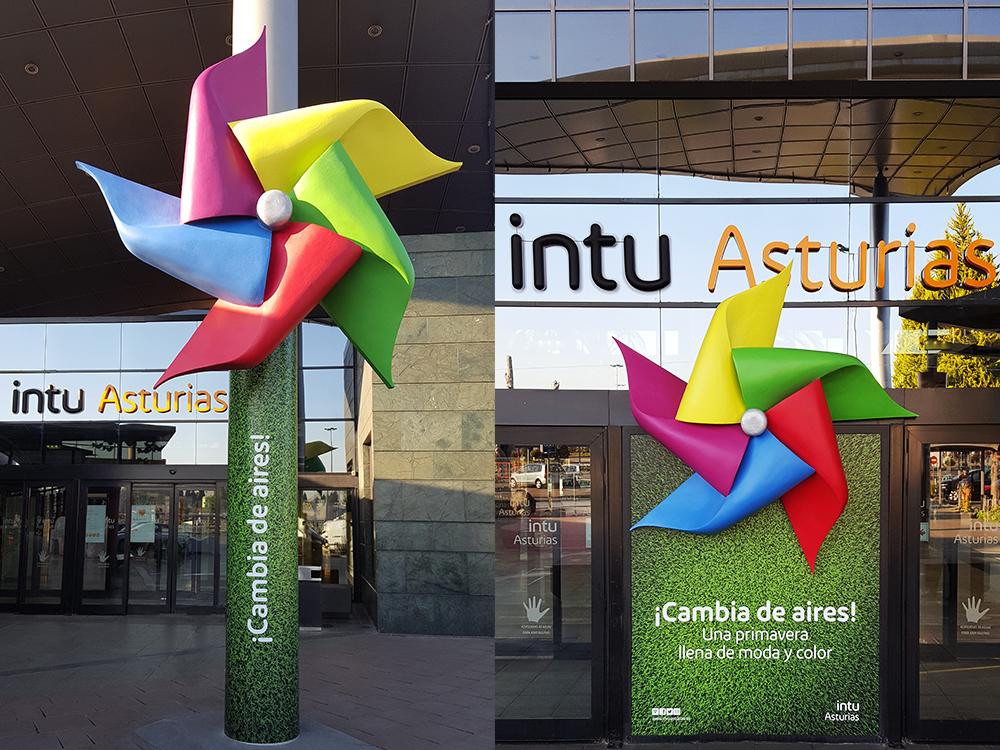 Ficticios de dos grandes molinillos de viento realizados en pórex. Uno para la puerta principal, fijo y el otro, de mayor tamaño, ubicado en columna exterior que giraba con la fuerza del viento. Decoración para temporada de primavera en el centro comercial Intu Asturias: «¡Cambia de aires!»