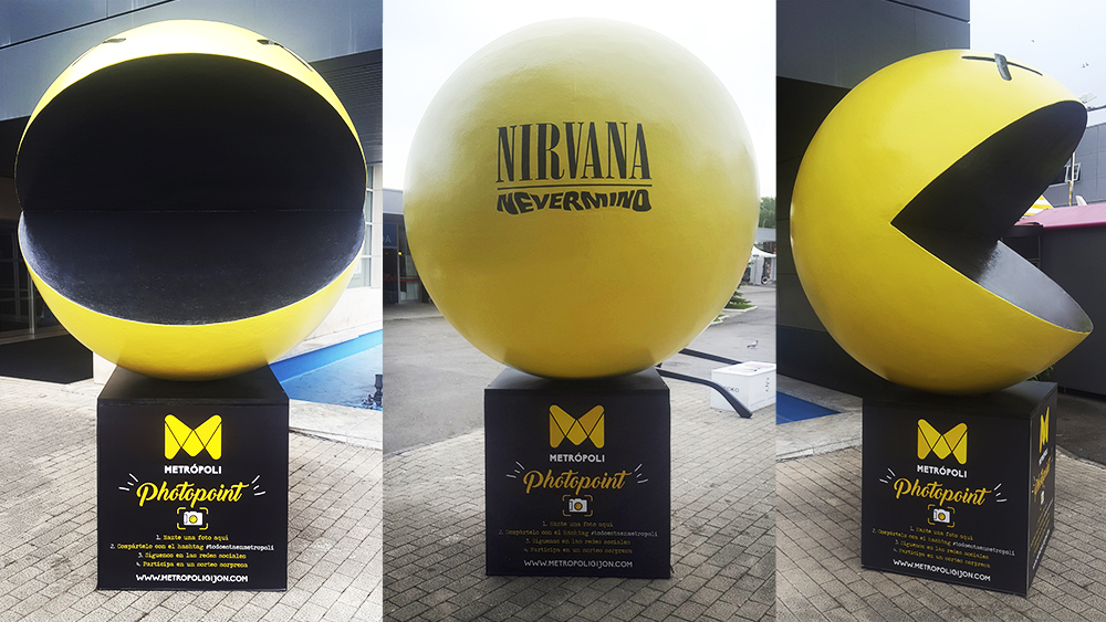 Escultura de gran formato tallada en Pórex. Fusión de Pac-Man y logo de Nirvana-Nevermind. Utilizado como Photopoint. Encargo de Metrópoli Gijón para su edición de 2017 y 2018 celebrada en el recinto ferial Luis Adaro.