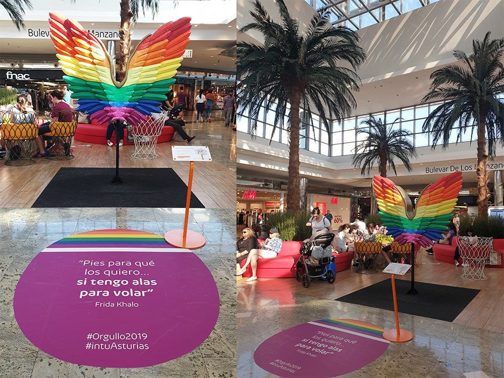 Alas talladas en Poliestireno Expandido, EPS, con estructura interna de hierro pintadas con los colores de la bandera del orgullo gay con motivo de su celebración en 2019, utilizadas como photocall en el centro comercial Intu Asturias.