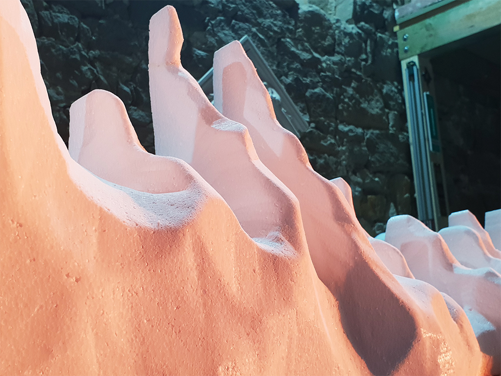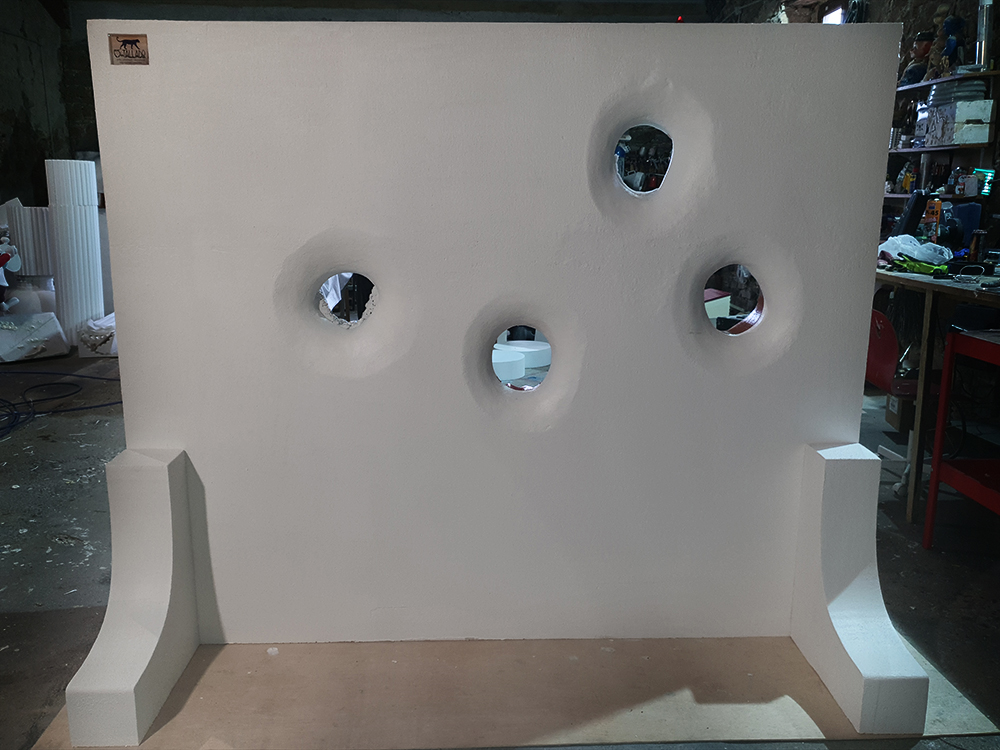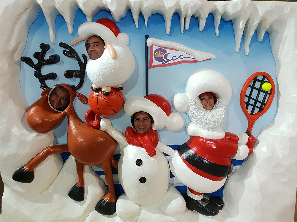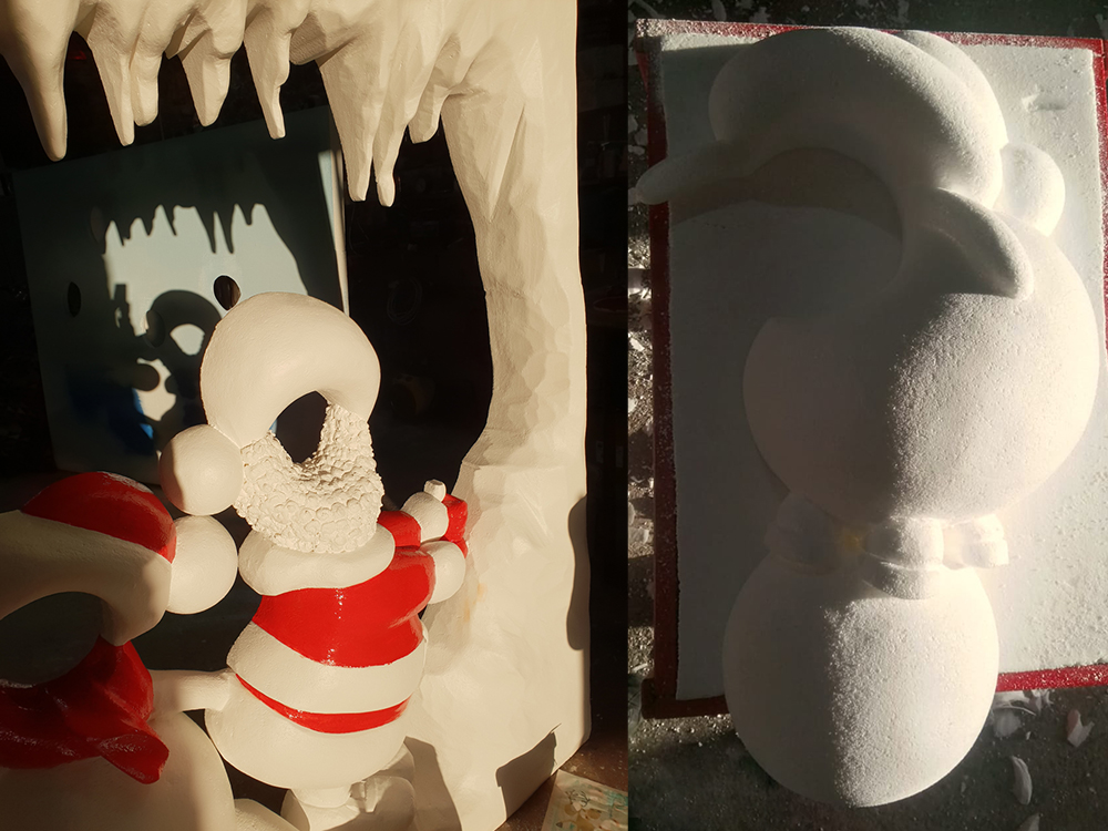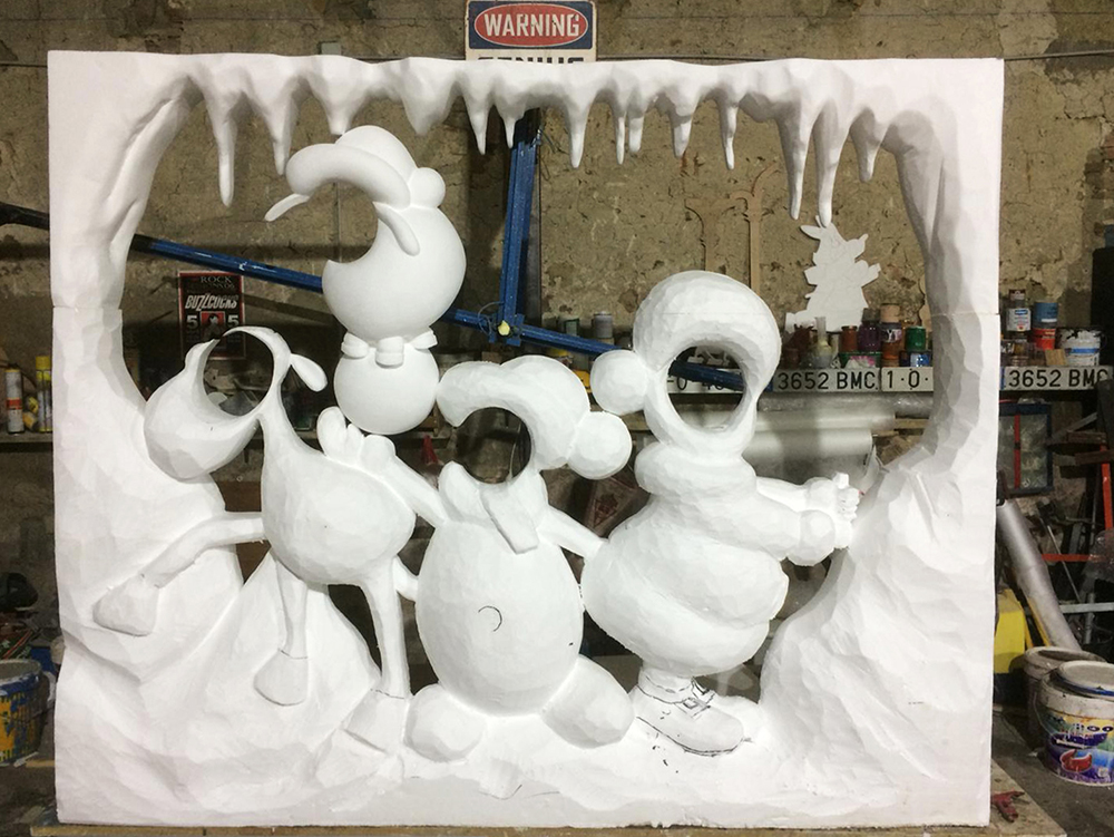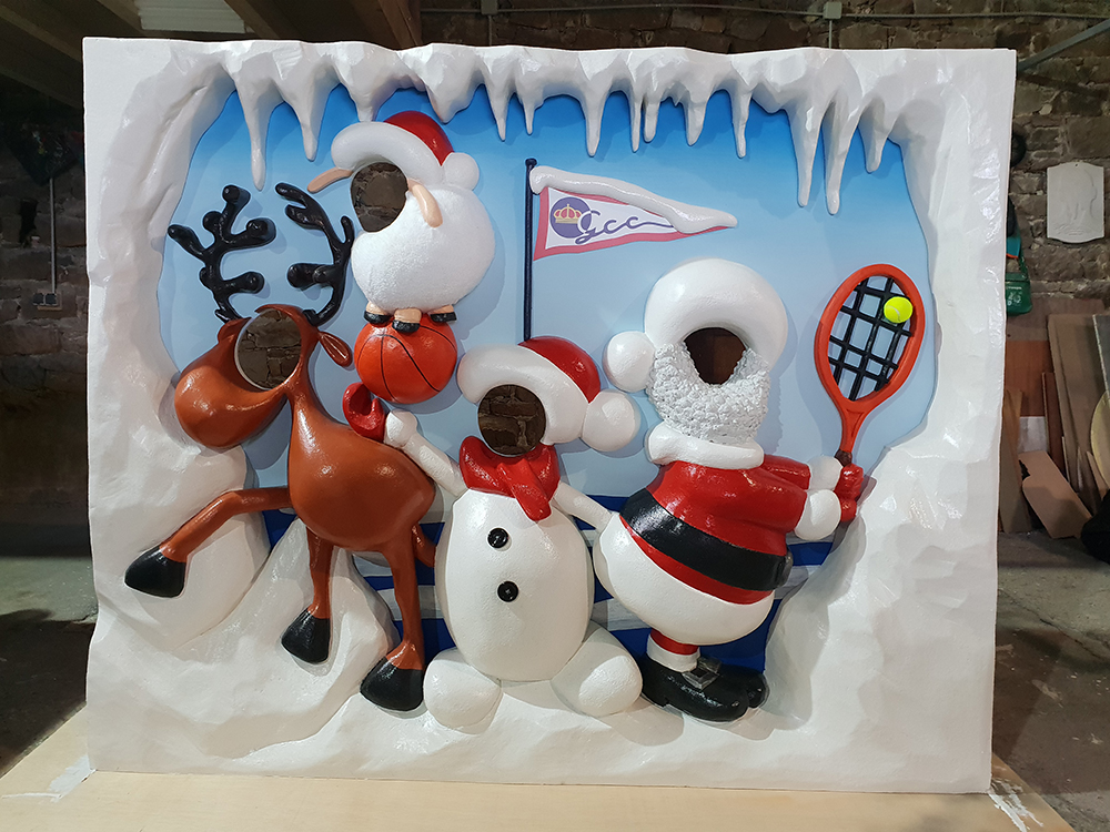 Talla de Photocall en relieve con motivos navideños para el Real Grupo de Cultura Covadonga de Gijón. Tallado en EPS, porexpan, con recubrimiento de caucho y pintura artística.