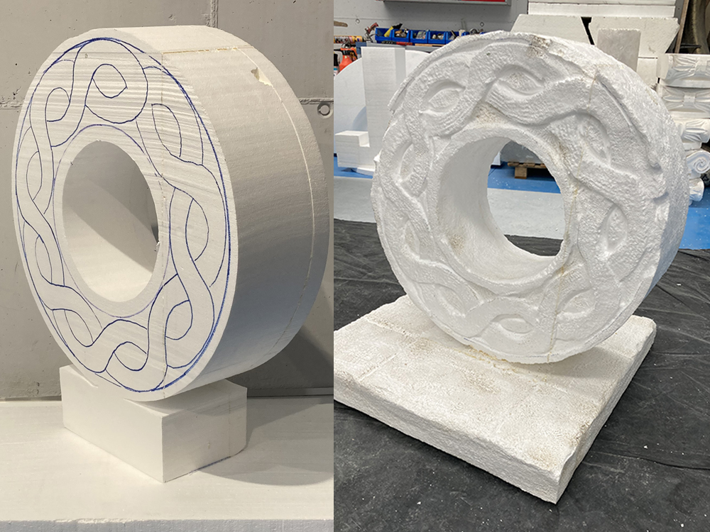 La reproducción fue desarrollada mediante talla de Pórex (EPS) y técnicas de reproducción de texturas pétreas, con el objetivo de generar una pieza fiel al aspecto arqueológico original y adaptada a un entorno museístico contemporáneo.