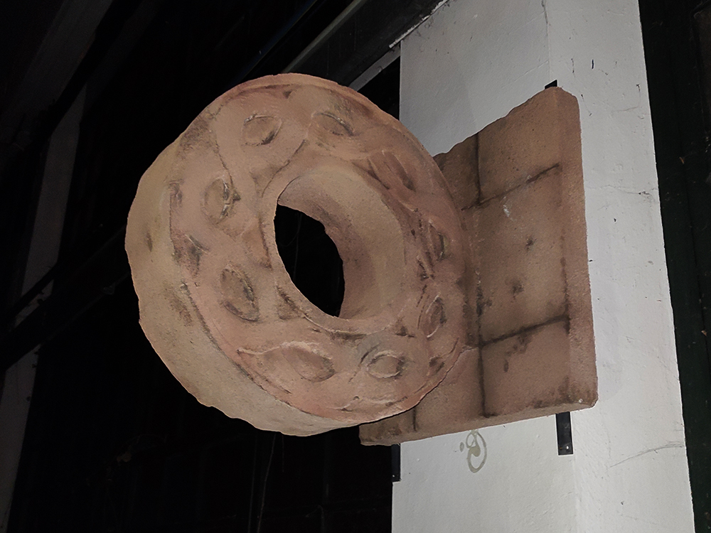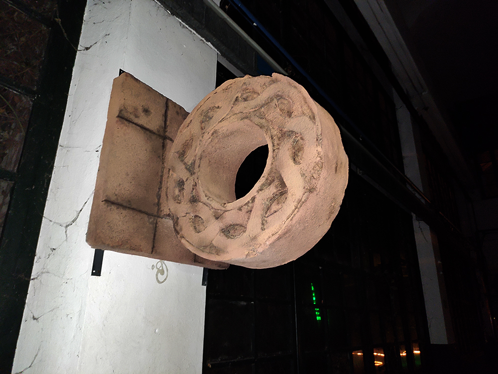 Inspirada en los aros de piedra que formaban parte de los campos del juego de pelota ritual, la escultura reproduce las formas y motivos ornamentales característicos de estas estructuras utilizadas en los recintos ceremoniales de culturas como la mexica y la maya.