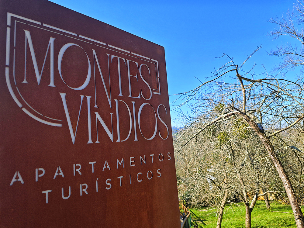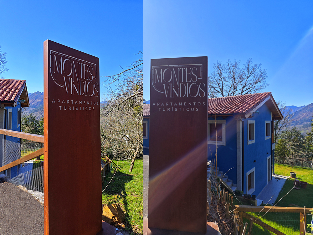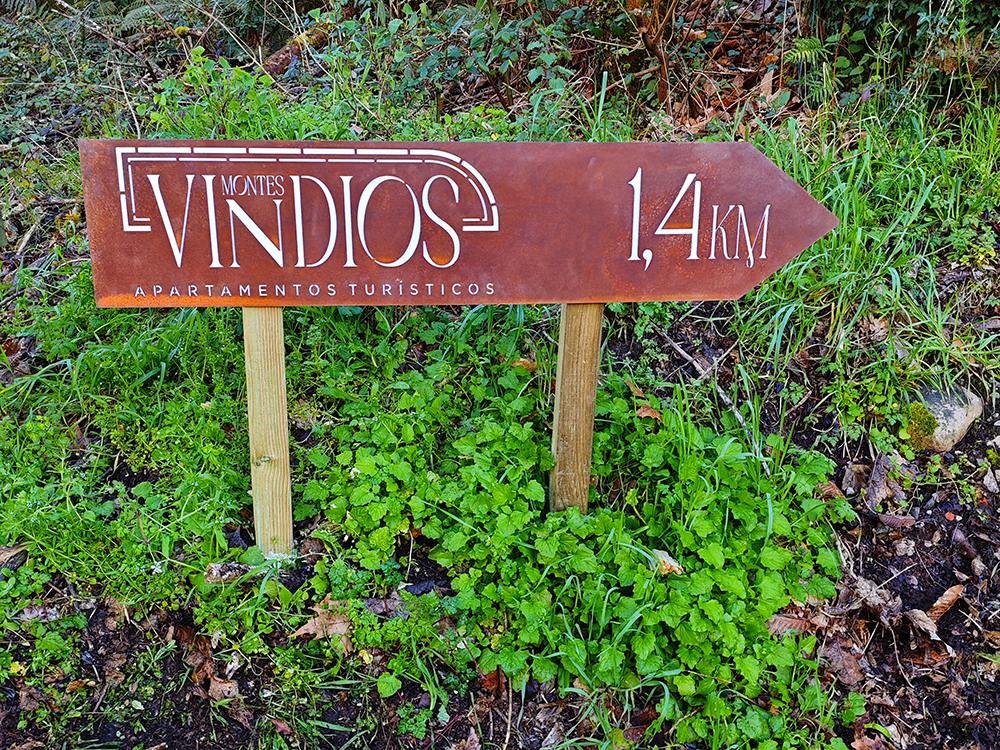 Fabricación e instalación de elementos de señalética en acero corten, incluyendo un monolito de entrada y cartelería personalizada, para el complejo turístico Montes Vindios Apartamentos Turísticos.